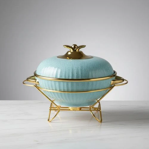 Son couvercle assorti, surmonté d’un bouton décoratif doré, permet de conserver la chaleur de vos préparations tout en ajoutant une note sophistiquée. L’ensemble repose sur un support métallique doré aux lignes fines et aériennes, équipé de poignées latérales pour une manipulation facile et sécurisée.
